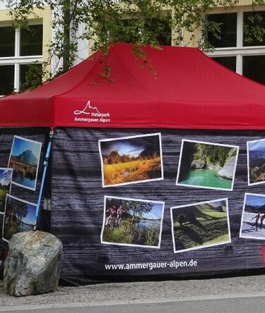 In the course of the Bavarian State Exhibition 2018, an Ecotent® pop up gazebon took up position in front of the Ettal Monastery - as a mobile information stand of the Ammergau Alps Nature Park.