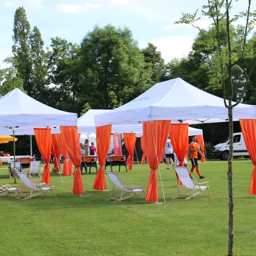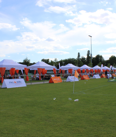 Approximately 400 guests accepted the invitation and found an event location covered in the typical ING-look: From afar, they saw countless Ecotent® pop up gazebos in the white and orange CI-design, circle flags and banners lined the place.
